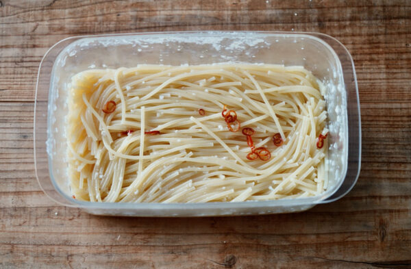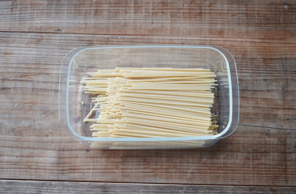 スパゲッティは半分に折り、深めの耐熱容器に入れる。