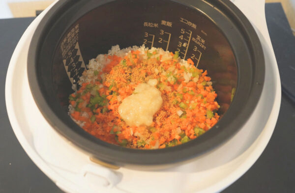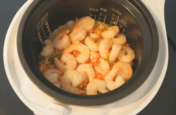 (1)と凍ったままのエビをのせて炊飯する。(炊き込みご飯モードまたは普通炊き)
