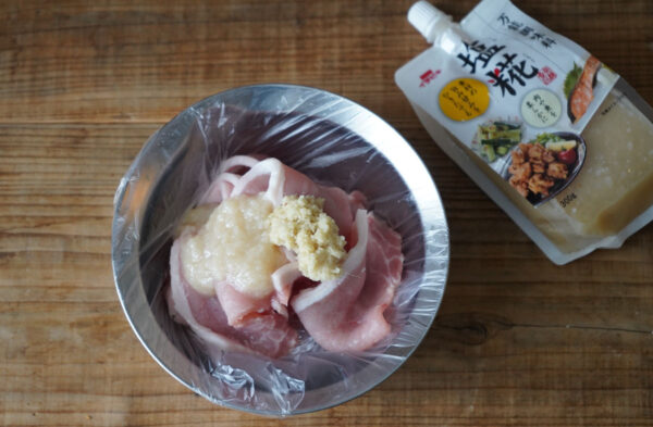 ポリ袋に豚肉、塩糀、しょうがを入れて全体にもみ込み、冷蔵庫で30分以上おく。
