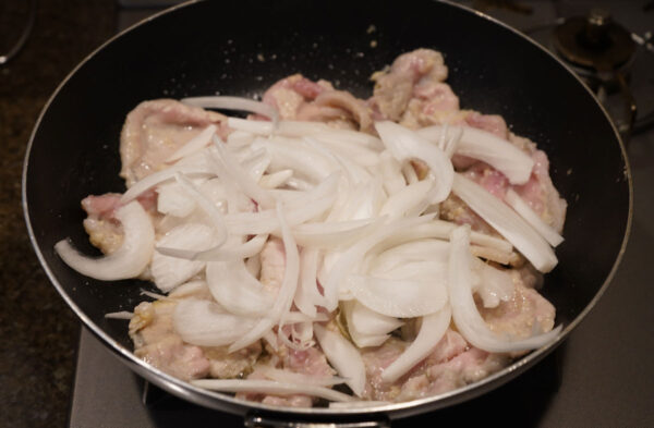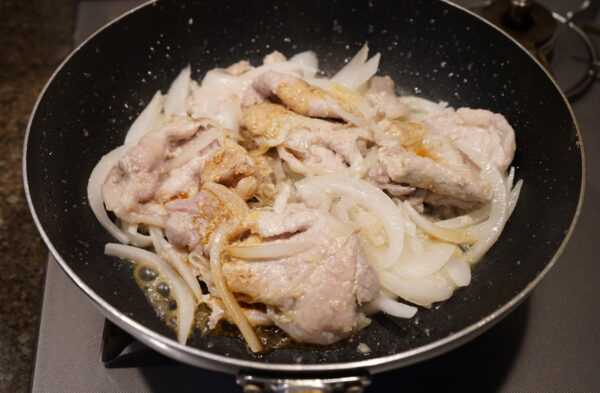 フライパンにごま油を熱し、豚肉を焼く。色が変わってきたら玉ねぎを加え、しんなりするまで炒める。