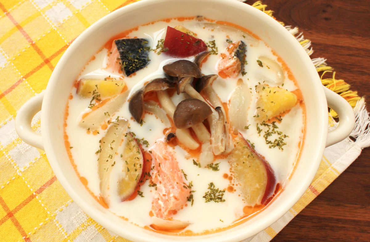 鮭とさつまいもを使った、和風のミルクスープです。新しいスープのレパートリーにいかがでしょうか。