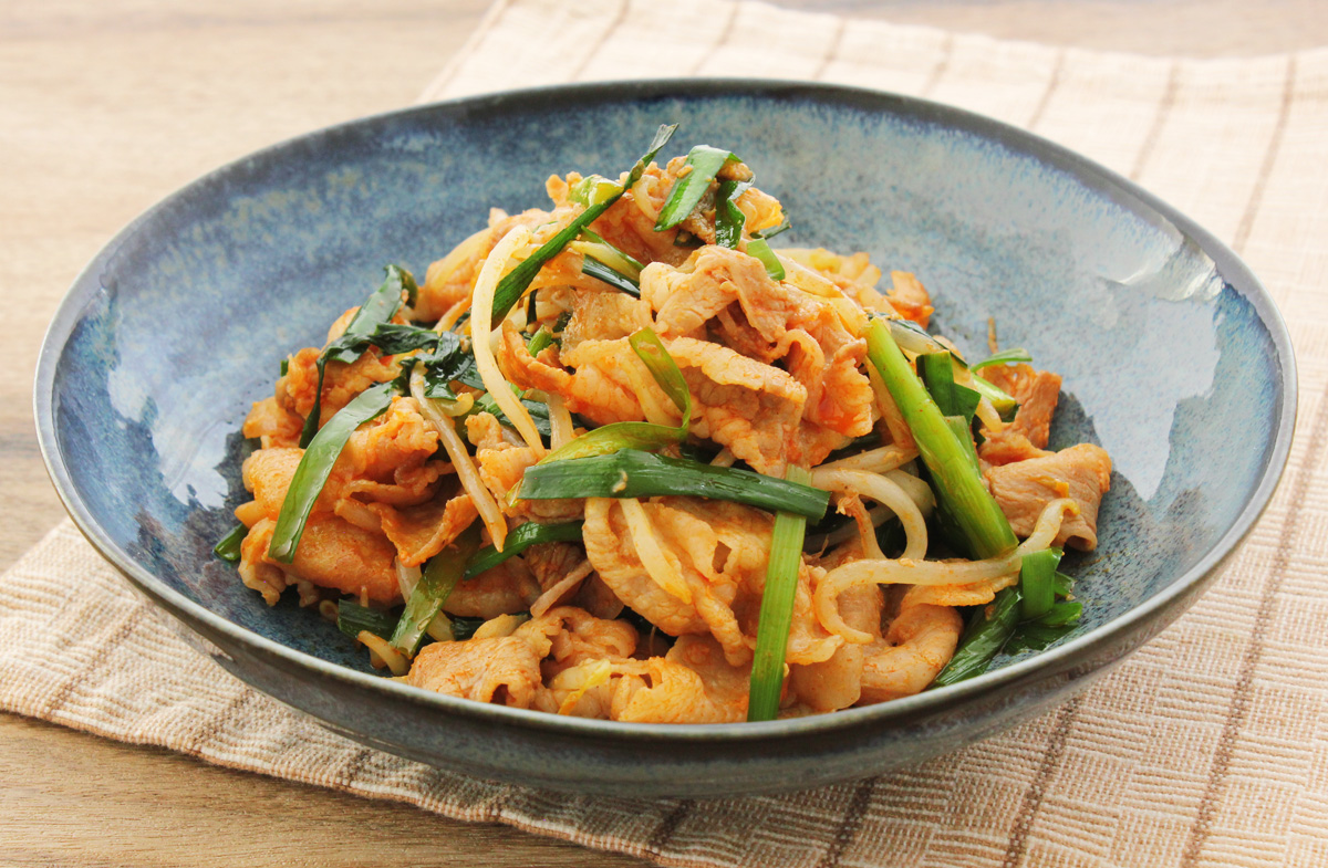 火が通ったら、ニラ、もやしを加えて炒め、旨辛塩糀を入れて、軽く炒め合わせる。
