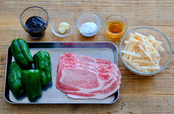 豚肉、ピーマンは細切りにする。豚肉に片栗粉をまぶす。