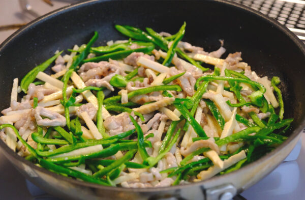 フライパンにごま油を中火で熱し、豚肉、ピーマン、竹の子の順に炒める。
