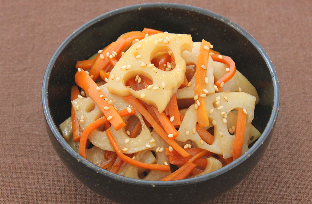 れんこんは5mm幅のいちょう切りにし、水につけてアク抜きする。にんじんは細切りにする。