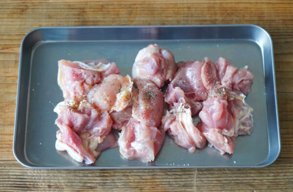 鶏もも肉は食べやすい大きさに切り、塩とこしょうをふる。