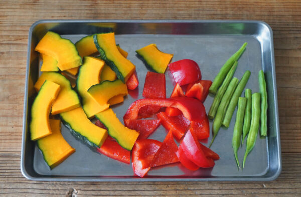 かぼちゃはインゲンとパプリカよりも早い段階で加熱をすることで、ホクホクに仕上げます。