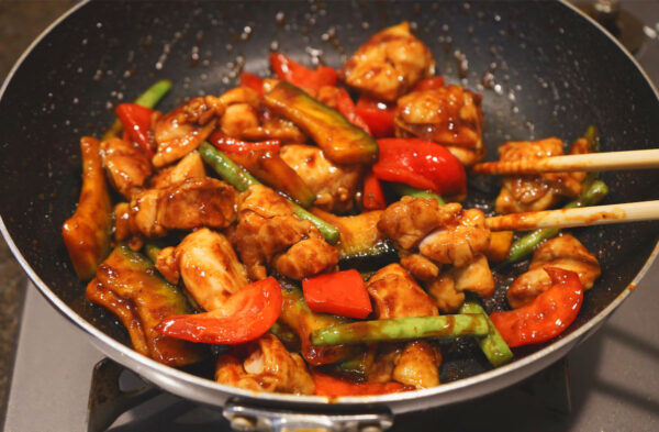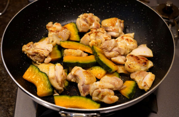 フライパンに油を熱し、鶏もも肉を入れて炒める。肉の色が変わってきたらかぼちゃを加え、肉に焼き色がつくまで炒める。