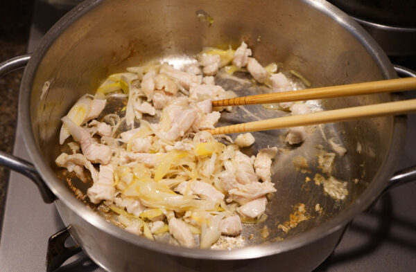 フライパンにごま油を熱し、鶏もも肉と長ねぎを入れて弱めの中火で炒める。