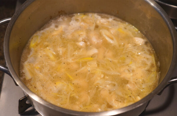 鶏もも肉の色が変わったら水を加え、沸騰したらAを加えて混ぜる。