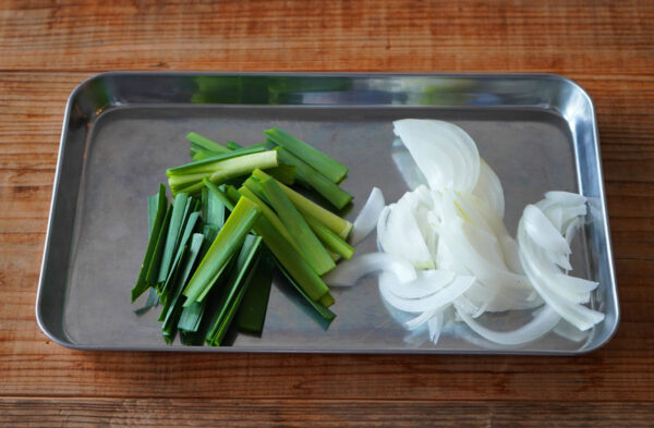 ニラは3cmの長さに切る。玉ねぎは薄切りにする。
