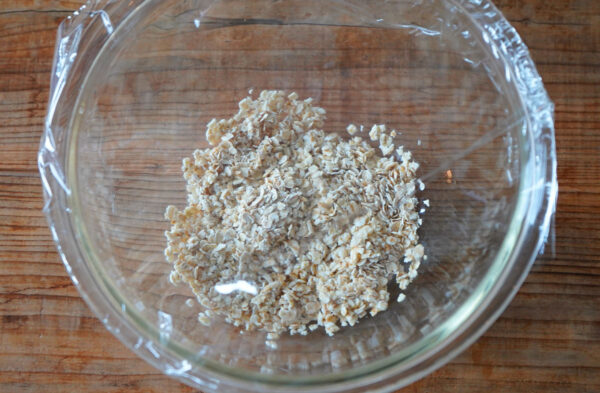 大きめのボウルにオートミールと水を入れ、ふんわりとラップをかけ電子レンジ(600W)で2分加熱する。