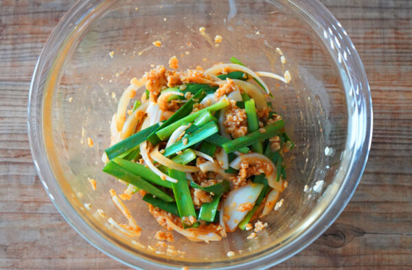 (2)のボウルに卵を割り入れ、赤から焼のたれと(1)を加えてよく混ぜ合わせる