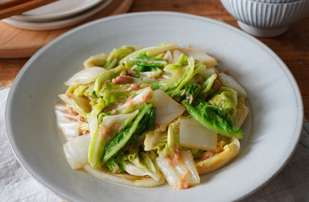 全体をよく混ぜ合わせ、白菜の葉の部分がしんなりしたら皿に盛りつける。