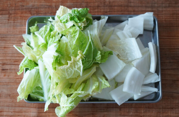 白菜は芯と葉に分けて、それぞれ食べやすい大きさに切る。
