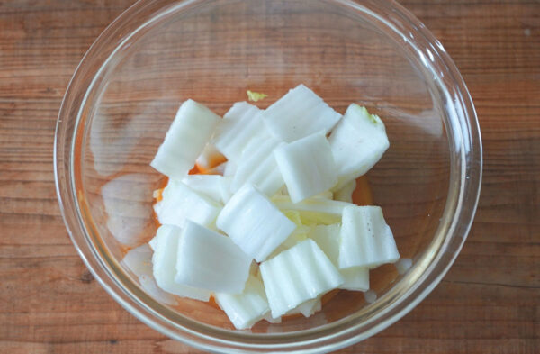 耐熱容器にAを混ぜ合わせたら白菜の芯の部分を加え、ふんわりとラップをかけ、電子レンジ(600W)で3分加熱する。