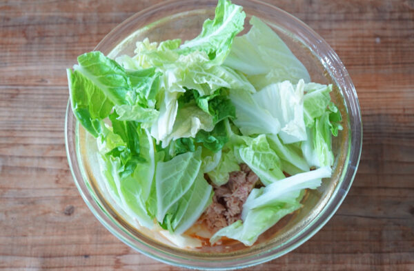 ツナ缶(オイルごと)と白菜の葉の部分を加えてふんわりとラップをかけ、電子レンジ(600W)で1分加熱する。