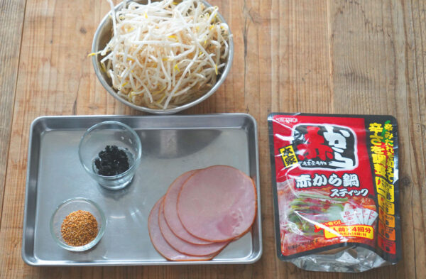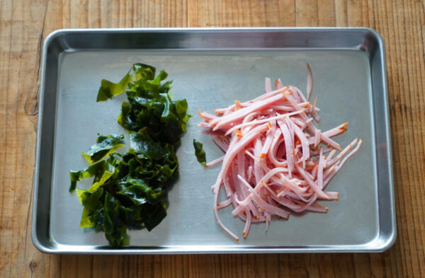 乾燥わかめはたっぷりの水に5分つけて戻し、水気を切って粗く刻む。ハムは細切りにする。