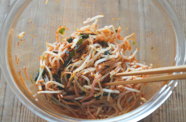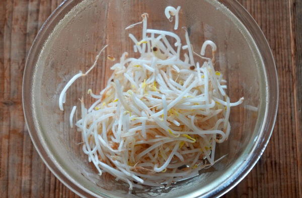 もやしは水洗いしてしっかりと水気を切り、耐熱ボウルに入れて、ラップをせずに電子レンジ(600W)で3分加熱する。