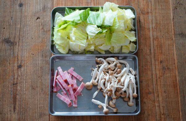 キャベツは食べやすい大きさに切る。しめじは石づきを切り、小房にわける。ベーコンは幅1cmの短冊切りにする。