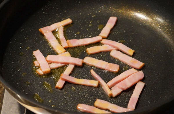 フライパンに油を熱し、ベーコンを入れて香ばしい香りが出るまで炒めたら、キャベツ、しめじ、にんにくを加えてさらに炒める。
