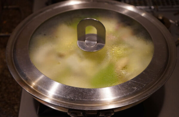 (2)に塩糀と水を入れ、蓋をして弱火で3分蒸し煮する。