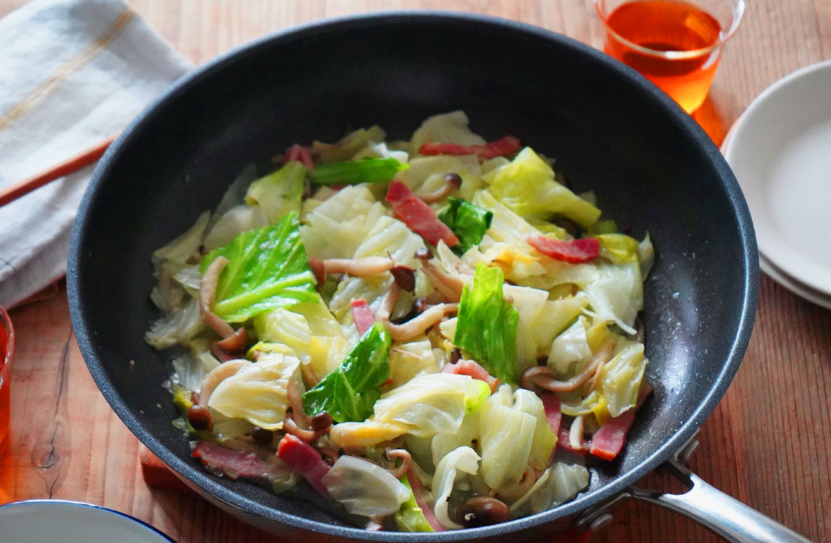フライパンに油を熱し、ベーコンを入れて香ばしい香りが出るまで炒めたら、キャベツ、しめじ、にんにくを加えてさらに炒める。