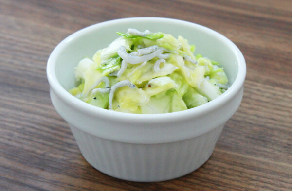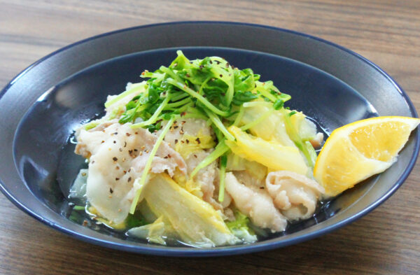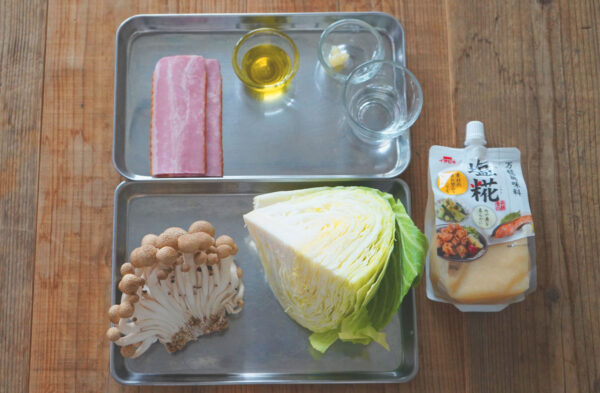 キャベツは食べやすい大きさに切る。しめじは石づきを切り、小房にわける。ベーコンは幅1cmの短冊切りにする。