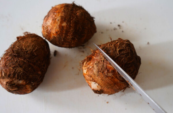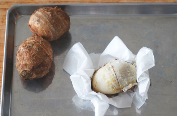 電子レンジ加熱した里芋はとても熱くなっています。少し粗熱を取ってからキッチンペーパーなどで包み、里芋の皮をむくようにしてください。加熱時間はご家庭の電子レンジに合わせて調整してください。