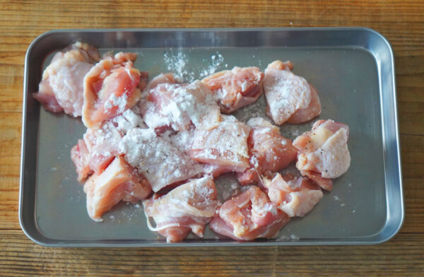 鶏肉は食べやすい大きさに切り、塩とこしょう、片栗粉(分量外)をまぶしておく。