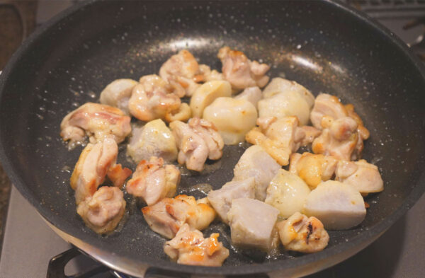 フライパンに油を熱し、鶏肉を入れて色が変わるまで炒める。里芋を加えて、サッと炒める。