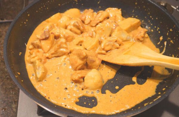 (4)に献立いろいろみそ、牛乳、片栗粉を入れてよく混ぜたら、中火で2分間(とろみがつくまで)加熱する。