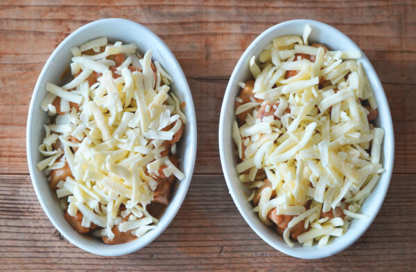 耐熱容器に(5)を入れてピザ用チーズをのせたら、トースターでチーズが溶けるまで焼く。お好みで乾燥パセリを散らす。