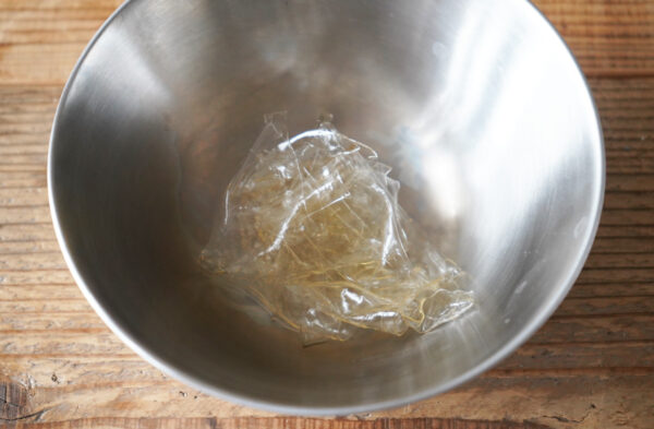 板ゼラチンは冷水に3分浸してふやかし、水気を切る。(粉ゼラチンを使う場合は、5gの粉ゼラチンを大さじ2の水でふやかす。)