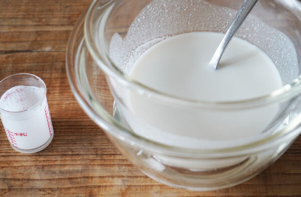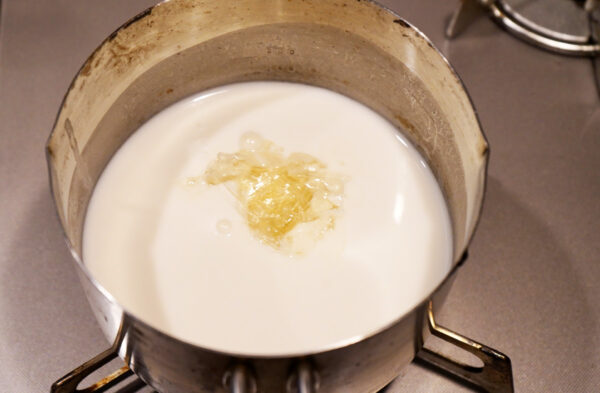 小鍋にアーモンドミルクを入れて、沸騰直前まで加熱し、火を止める。さらにゼラチンと糀あま酒を入れて溶かす。