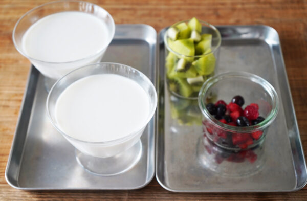 ベリーミックスを解凍し、キウイを食べやすい大きさに切る。食べる直前にトッピングする。