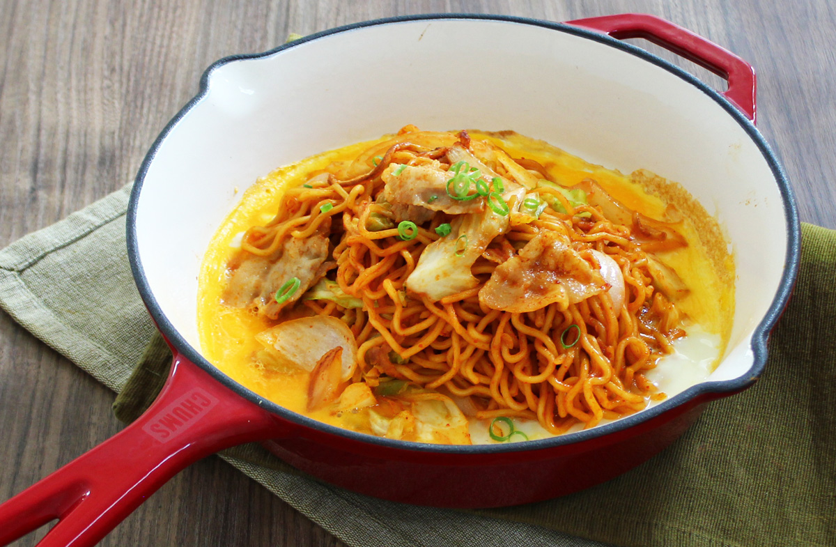 赤から焼のたれとスキレットで作るキャンプ飯!薄焼き玉子がポイント◎赤から焼きそば