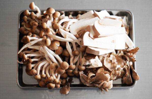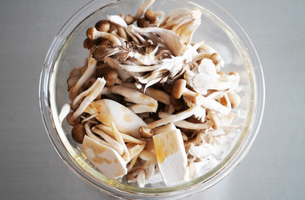 しめじは石突きを切り、小房に分ける。まいたけは手でさく。エリンギは半分の長さに切り、薄切りにする。