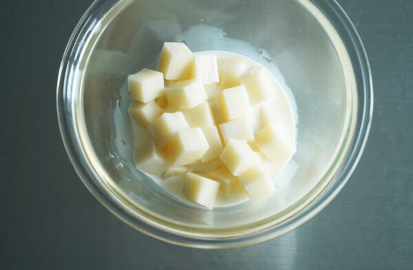 切り餅は小さめの角切りにして耐熱ボウルに入れる。牛乳を加え、電子レンジ(600W)で4分加熱する。