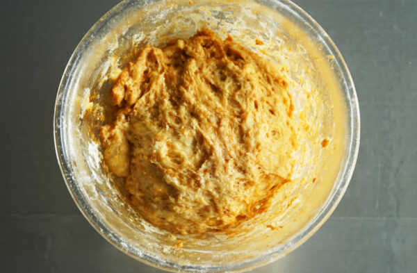 泡立て器でしっかりと混ぜ、Aを入れる。ゴムベラなどでさらに混ぜ、ひとかたまりにする。