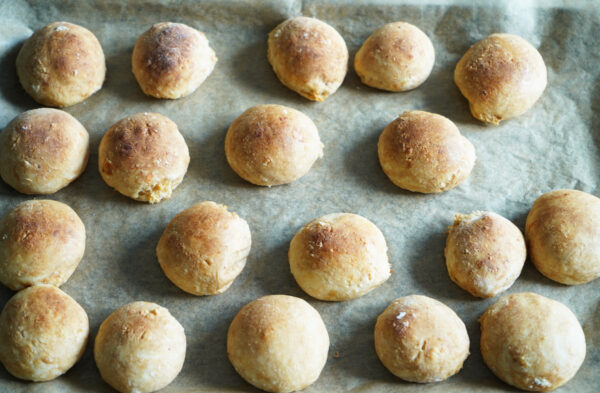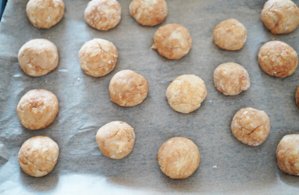 3cm程度に丸め、クッキングシートを敷いた天板に、間隔をあけて並べる。(生地が手につく場合は、手に片栗粉をまぶすと丸めやすくなります。)