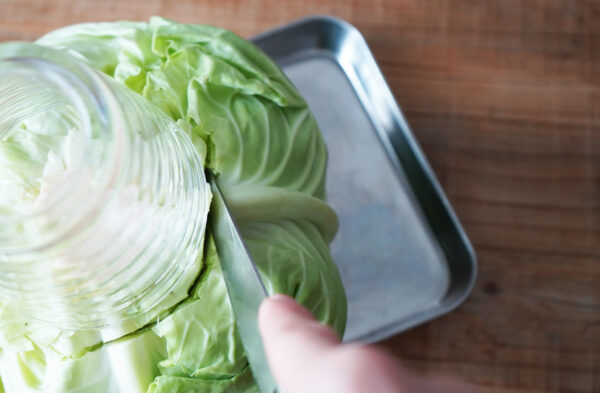 キャベツは芯の周りに包丁で一周の切り込みを入れる。(写真では、ガラスのコップを目印に使いました。)