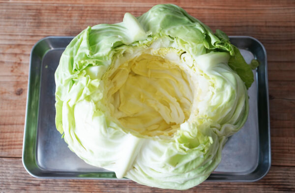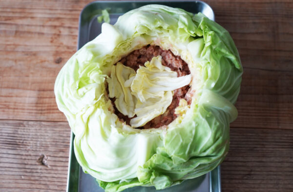 1つずつ巻く作業はなし、キャベツの芯をくり抜いて挽き肉を詰めるだけの簡単レシピをご紹介します。キャベツを1玉丸ごと使い切れるのも嬉しいポイント。