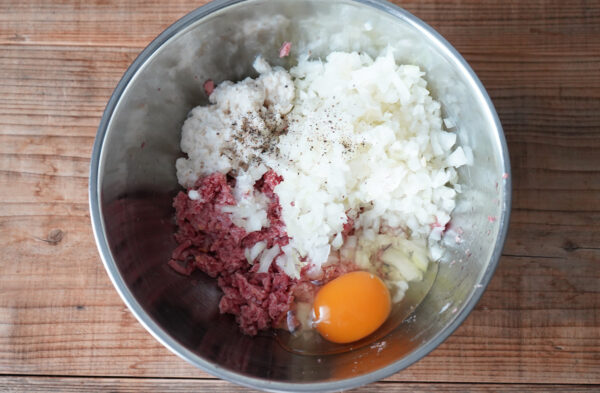 玉ねぎはみじん切りにする。ボウルにAと玉ねぎを入れて、よく混ぜ合わせる。