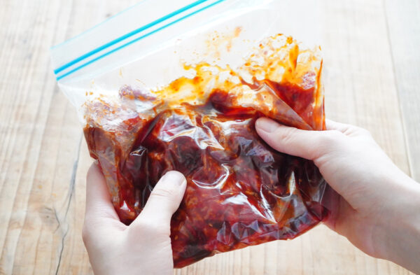 ポリ袋に牛肉とAを入れてよく揉み込み、10分以上置く。