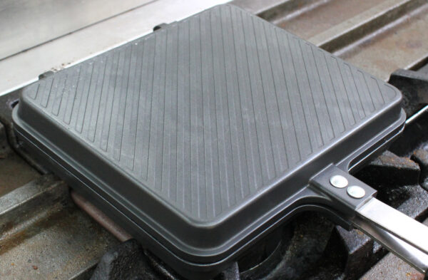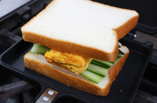 ホットサンドメーカーに食パンを横向きに置いて、サラダチキン、きゅうりの断面を少しずつずらして横向きに置く。玉子焼きは縦向きに置き、食パンを重ね、フタを閉める。