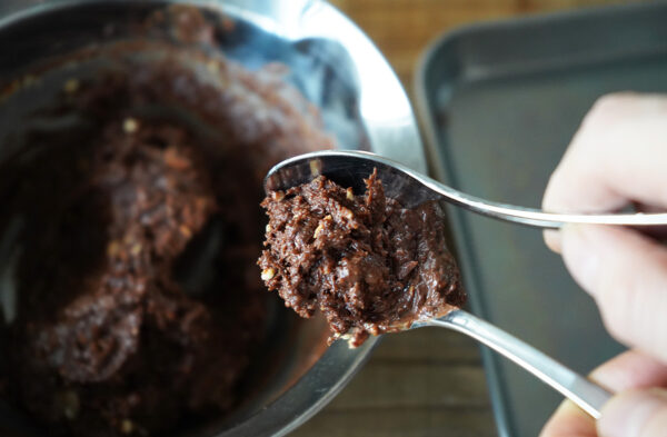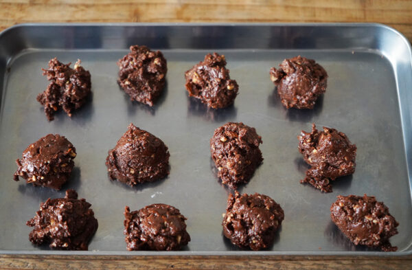 チョコレートに(1)、糀あま酒を入れて混ぜ、もったりとしてきたらスプーンで2~3cmに取り分け、バットに並べる。