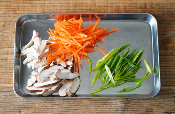 しいたけは薄切り、にんじんは細切り、小ねぎは斜め薄切りにする。Aを混ぜておく。