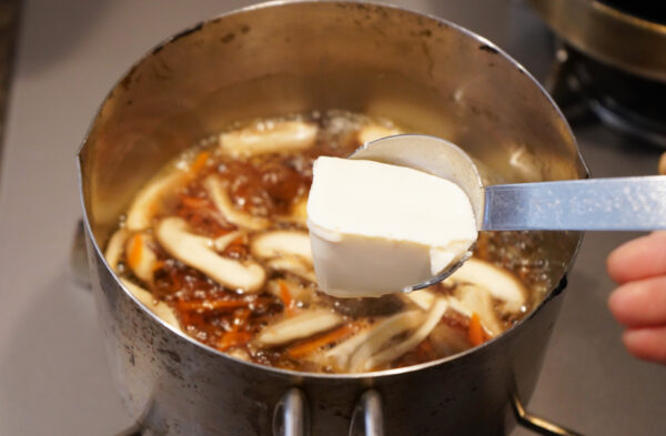 よく混ぜながら、Aの水溶き片栗粉を入れる。豆腐をスプーンで一口大に崩して入れる。
