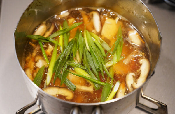 鍋に水を入れて熱し、沸騰したら、しいたけ、にんじん、国産だし醤油を入れる。
